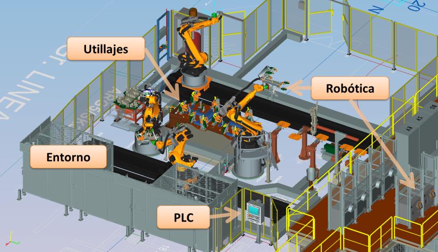 Esta simulación robótica virtual integra el trabajo de cuatro módulos (robótica, utillaje, entorno y PLC - Programmable Logic Controller) solventando los problemas derivados de poner en común dichos módulos en la fase de montaje y no antes. El proyecto Plug & Play pretende que todas las modificaciones necesarias puedan hacerse en fases anteriores al montaje en planta de producción, incluso antes de la fabricación reduciendo las pérdidas a nivel de productividad y recursos. Esta virtualización del proceso reduce los costes derivados de las modificaciones ya que se anticipan a la condición ‘Off-tool’. El concepto de condición ‘Off-tool’ implica que los utillajes, robots y demás elementos del entorno están listos para su instalación final. Cualquier incidencia después de este punto, supone que los elementos afectados sean devueltos a su fabricante de origen para ser modificados, o el desplazamiento de personal especializado para su modificación.