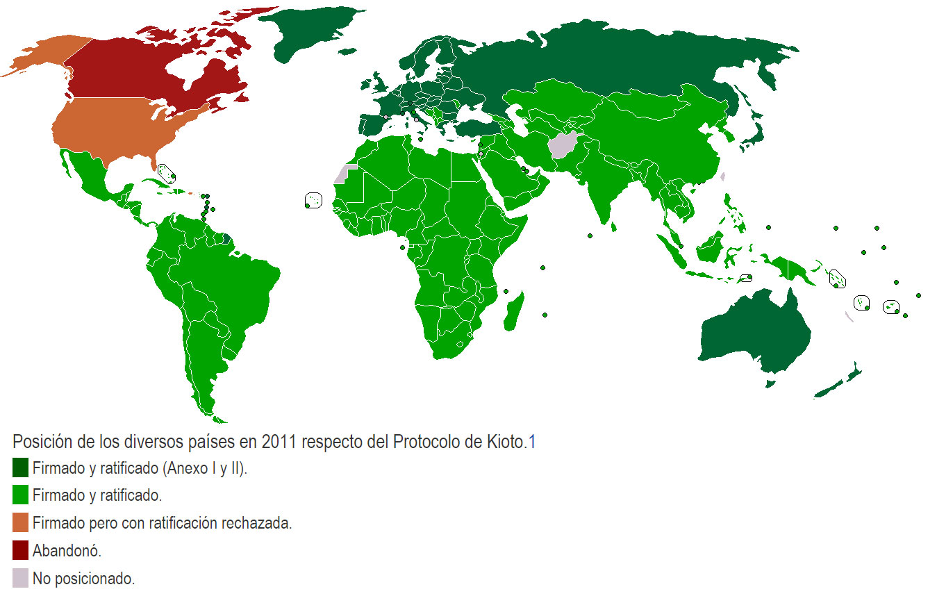 El primer periodo del acuerdo fue ratificado por 191 países, más la Unión Europea, que actúa como Parte del Protocolo independientemente de sus estados miembros y divide los esfuerzos de reducción entre éstos. Estados Unidos no llegó a ratificar el acuerdo pese a haberlo firmado en 1998 bajo la presidencia de Bill Clinton. La ratificación de este país se vio complicada por la negativa por parte del Congreso, tras lo que se produjo el anuncio de la retirada del mismo por parte la Administración Bush en 2001. Tras este acontecimiento, la suerte del Protocolo cayó en manos de Rusia, pues para que el acuerdo entrase en vigor era necesaria su ratificación por un mínimo de 55 Partes que fueran responsables de al menos el 55% de las emisiones globales.