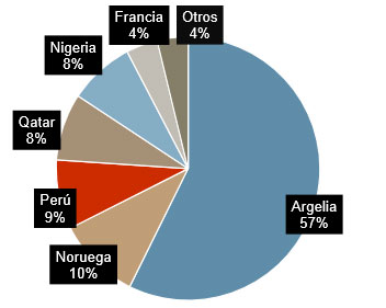 Argelia se sitúa de esta forma muy por encima del resto de principales suministradores internacionales, que son Noruega (10%), Perú (9%), Nigeria (8%), Catar (8%) y Francia (4%).