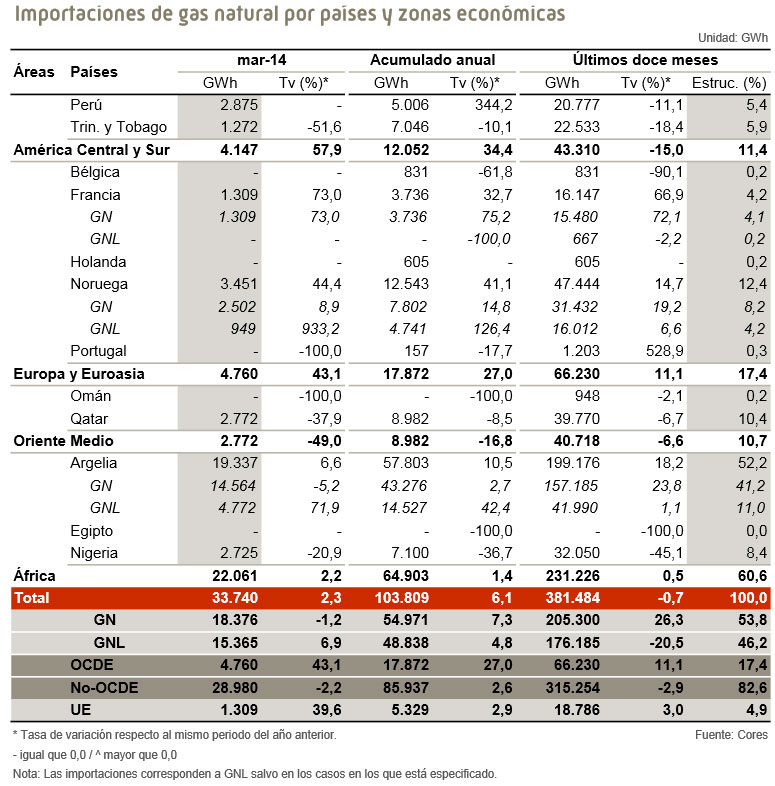 España importó durante el mes de marzo 33.740 GWh de gas natural, un 2,3% más que en el mismo mes del año pasado, y acumula en los doce meses que van de abril de 2013 a marzo de 2014 la compra de 381.484 GWh, lo que representa un 0,7% menos. En estos últimos doce meses, las entradas de gas procedentes de Argelia equivalieron al 52,2%. En concreto, el 41,1% llegó a través de los dos gasoductos internacionales con este país, y otro 11,1% lo hizo en barcos metaneros (Gas Natural Licuado - GNL).