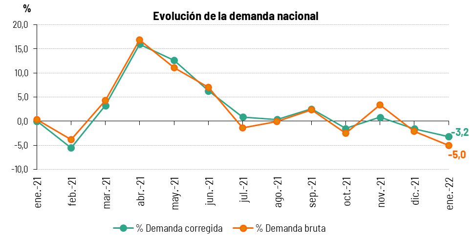 En el sistema eléctrico peninsular, la demanda de este mes se estima en 21.479 GWh, un 5,6% inferior a la registrada en enero de 2021. Si se tienen en cuenta los efectos del calendario y las temperaturas, la demanda es un 3,7% inferior a la del mismo mes del año anterior.