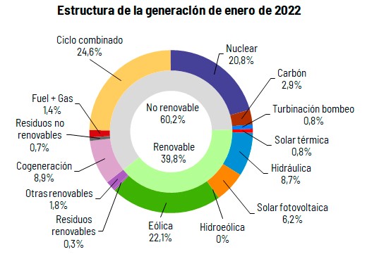 La generación procedente de fuentes de energía renovable del pasado mes de enero representó el 39,8% del mix. Por su parte, las tecnologías que no emiten CO2 equivalente (gases de efecto invernadero) supusieron el 60,6% del total.