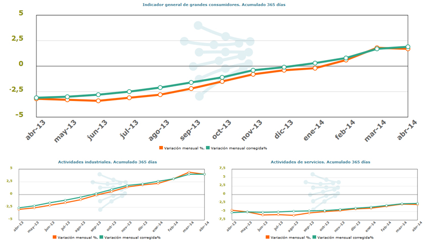 Comparado con abril del 2013, de las cinco actividades con mayor consumo eléctrico la demanda de la metalurgia bajó un 1,7 %, la industria química subió un 6,2 %, la fabricación de otros productos minerales no metálicos aumentó un 17,1 %, la industria de la alimentación también aumentó un 2,5 % y la del papel bajó un 1,2 %.