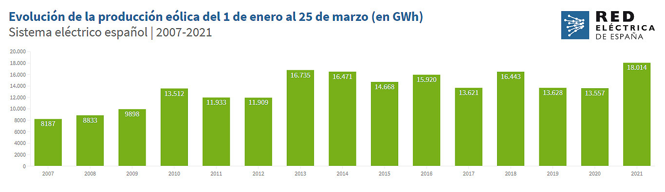 La energía producida con eólica hasta el 25 de marzo supone más del doble de lo generado por esta tecnología durante el primer trimestre de 2007, primer año del que Red Eléctrica cuenta con valores a nivel nacional. El año 2007 cerró con una representación de la eólica en la estructura de generación española de tan solo el 9,6%.