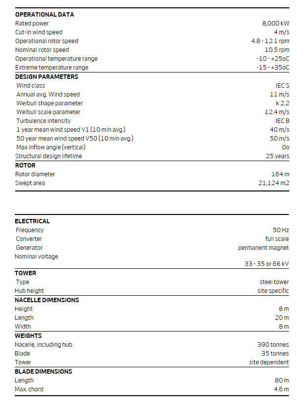 El prototipo, conocido como V164-8.0MW, es el aerogenerador más potente del mundo, con una unidad capaz de suministrar electricidad a 7.500 hogares. Tiene una torre de 140 metros de altura, con una altura máxima de turbina de 220 metros.
