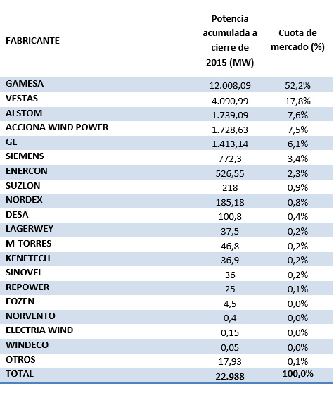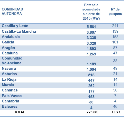 AEE. El año 2015 ha cerrado como el más negro de la historia de la eólica en España, con ningún nuevo megavatio instalado. Esto no ocurría desde los años ochenta, cuando empezó el tímido desarrollo del sector en nuestro país, que se aceleró en los noventa y se consolidó en la década siguiente, hasta alcanzar los 22.988 MW que hay actualmente. La producción eólica en el año se situó en 47.721 GWh, un 5,8% por debajo de la de 2014, y la cobertura de la demanda, en el 19,4%, según datos de REE.