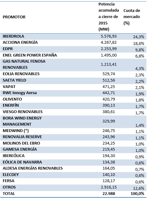 La cifra total por promotor está ligada a la potencia atribuible en función de su porcentaje de participación en los parques eólicos.