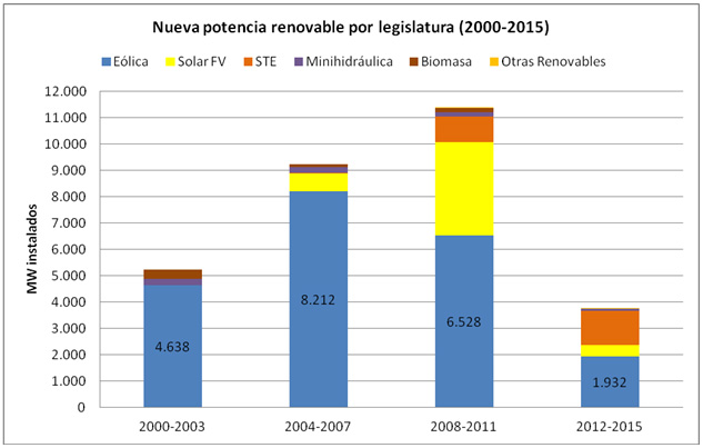 Si a esto se añade que en los últimos cuatro años sólo se han instalado 1.932 MW, esta legislatura ha sido la menos eólica con diferencia desde el año 2000, como resultado primero de la moratoria verde y después, de la Reforma Energética (ver gráfico adjunto). Es más, desde que entró en vigor el nuevo sistema retributivo en 2013, sólo se han instalado 27 MW, un 1,4% del total acumulado en la última legislatura. De hecho, la industria eólica española lleva varios años sobreviviendo gracias a las exportaciones (en 2014 y 2015 ha exportado el 100% de su fabricación).
