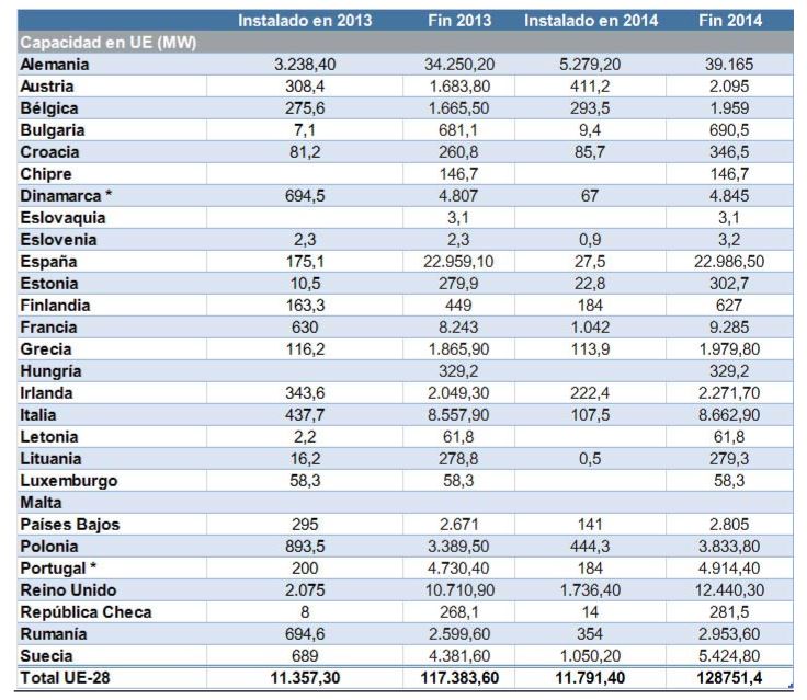 La energía eólica dio muestras de buena salud en la Unión Europea en 2014, con 11.791 MW nuevos megavatios eólicos –un 5,3% más que el año anterior–, hasta alcanzar una capacidad acumulada de 128,8 GW, según los datos de la Asociación Europea de Energía Eólica (EWEA). De los 22 países que instalaron nueva potencia en el año, sólo cuatro estuvieron por debajo de España: Bulgaria, República Checa, Lituania y Estonia. Por el contrario, Alemania y Reino Unido, considerados un ejemplo por su política industrial y energética, acapararon el 59,5% de las nuevas instalaciones.