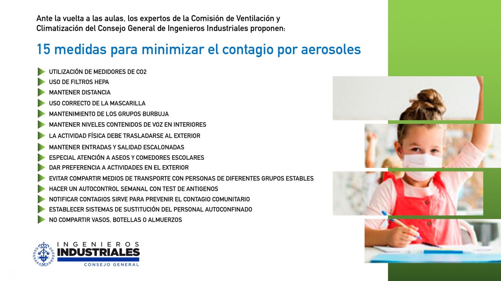 Por ello los expertos de la Comisión de Ventilación y Climatización del Consejo General de Colegios de Ingenieros Industriales (CGCOII) propone un conjunto de 15 medidas, que minimicen el contagio por aerosoles en espacios cerrados en la inminente vuelta al colegio y acorde a la situación epidemiológica que nos encontramos en cuanto a tasa de vacunación, población inmunizada, nuevas variantes, venta de test de antígenos, etc.
