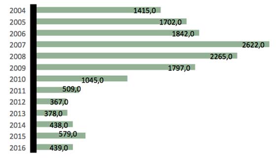 Volumen de licitaciones de ingeniería por la Administración 2004-2016, en millones de euros (Fuente: FIDEX)