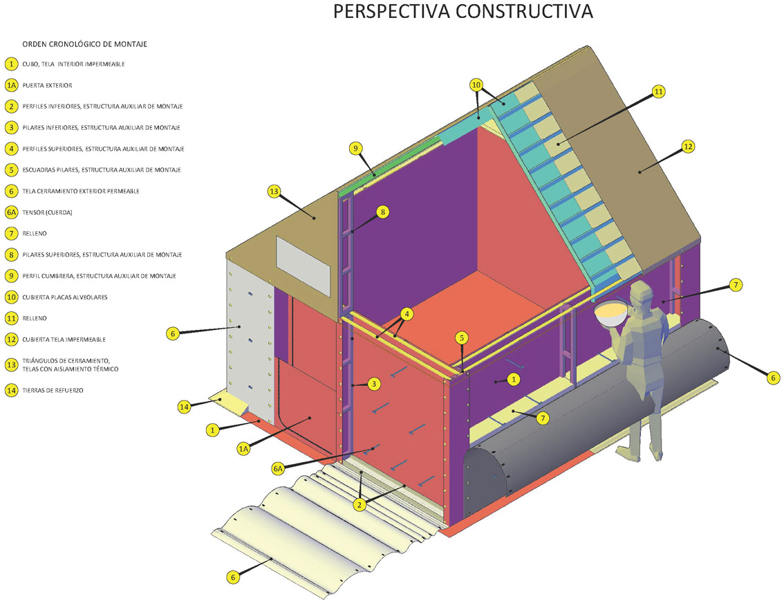 La clave del sistema diseñado por el equipo de ingenieros de Vielca estriba en unadoble cubierta pensada para ser rellenada con materiales del propio terreno donde se instale, bien sea arena, grava, tierra, ramas o nieve, que la dota a su vez de mayor robustez. “El sistema convierte la tienda en superaislante, capaz de soportar inclemencias meteorológicas extremas o un posible ataque, ya que los materiales son resistentes a impactos de bala y proporcionan un total aislamiento térmico, acústico y visual” afirma el responsable del proyecto, Vicente Candela.