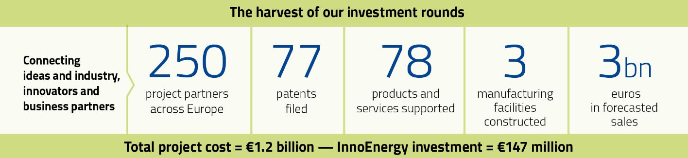 Desde 2011, las rondas de inversión han apoyado con éxito distintos proyectos que han llegado a recaudar un total de 1.200 millones de euros, de los que 147 provienen de la inversión de InnoEnergy y el resto, de empresas asociadas y otros inversores. Todo ello ha logrado la creación de 250 socios de proyectos en toda Europa, con 78 productos comercialmente viables y una previsión de ventas de hasta 3.000 millones de euros.