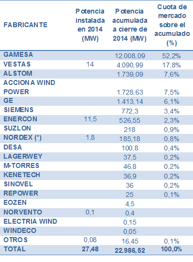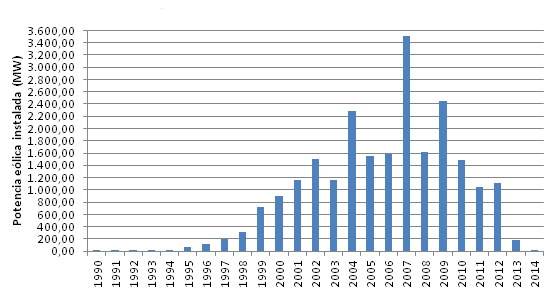 La potencia instalada eólica ha aumentado en tan solo 27,48 MW en 2014, el menor crecimiento en veinte años. De estos nuevos megavatios, tan sólo 14 MW corresponden a la instalación de un parque eólico, en Galicia. A esto hay que sumar que han entrado en funcionamiento los 11,5 MW del parque experimental Gorona del Viento, en la Isla de El Hierro. El resto son aerogeneradores aislados y aumentos de potencia nominal. Según los datos recopilados por AEE, la potencia eólica a 31 de diciembre se situaba en 22.986,5 MW.
