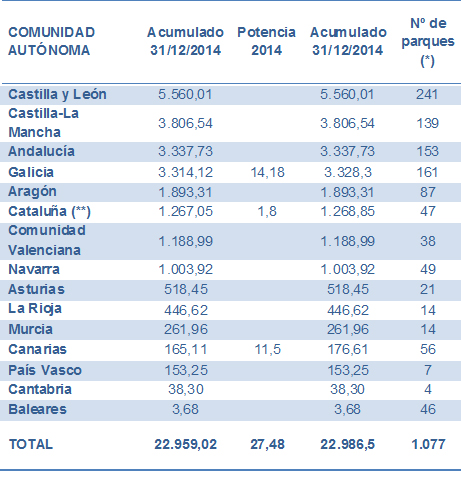 Según los datos recabados por AEE, que hace un seguimiento de todas las empresas del sector en España y utiliza el criterio de acta de puesta en servicio definitiva para realizar los cálculos, las únicas comunidades autónomas dónde aumentó la potencia eólica en 2014 fueron Galicia y Canarias (ver cuadro).