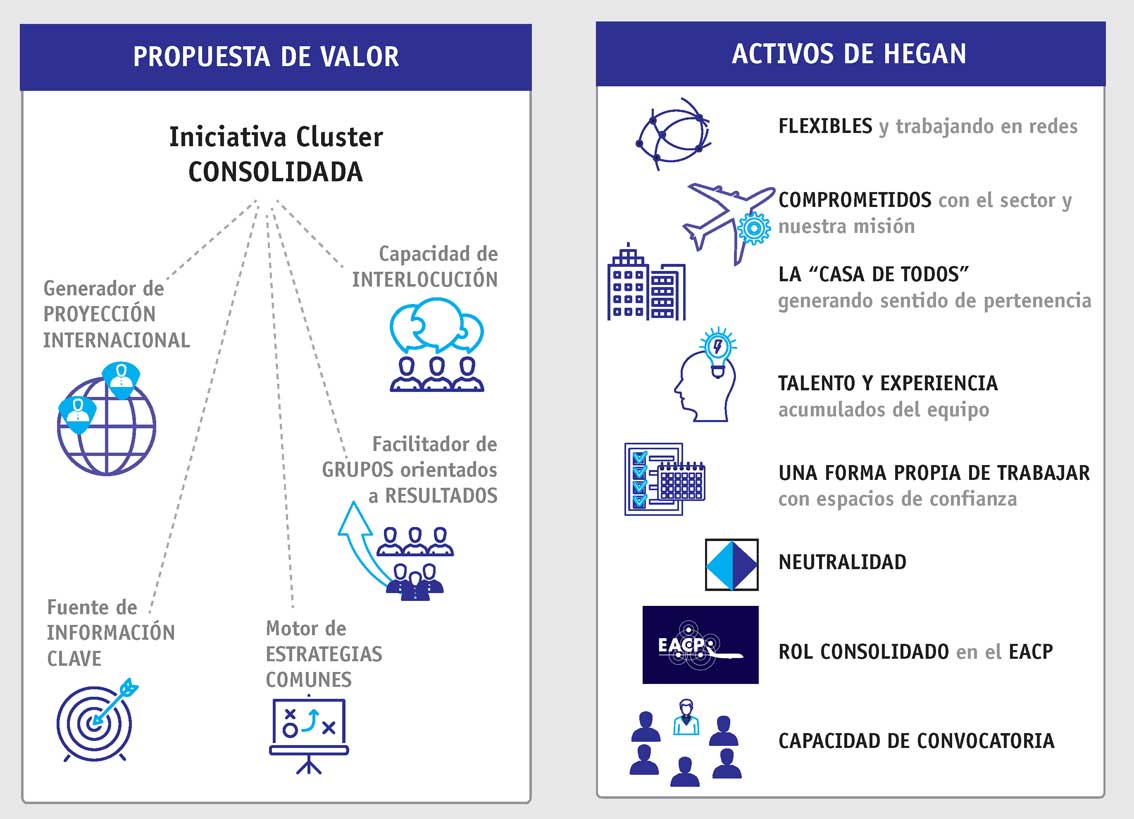 A través de las numerosas sesiones de trabajo y entrevistas con los socios y reuniones internas, HEGAN identificó las principales claves o retos a nivel global para el desarrollo de la competitividad del Cluster: Personas, Tecnología, Tamaño y Eficiencia, sustentados en la Cooperación y el Trabajo en Común, en los que la existencia de una asociación cluster puede aportar valor a la competitividad del cluster natural. “Porque sabemos que somos poderosos cuando cooperamos, cuando enfocamos nuestros recursos y capacidades hacia un reto compartido” como la Asociación declara en el documento.