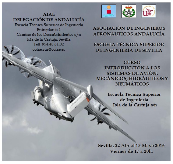 La Asociación de Ingenieros Aeronáuticos de Andalucía (AIAE) ha organizado, en colaboración con la Escuela Técnica Superior de Ingeniería de Sevilla, el curso "Introducción a los Sistemas de Avión. Mecánicos, Hidráulicos y Neumáticos”. Entre el 22 de abril y el 13 de mayo se impartirá en la ETSI de Sevilla, y tiene como objetivos: dar una visión general descriptiva de los sistemas mecánicos, hidráulicos y neumáticos de una aeronave; iniciar la familiarización de los alumnos con los sistemas y componentes del avión, así como mostrar de forma simplificada el esquema general de cada sistema, su funcionamiento y operación.