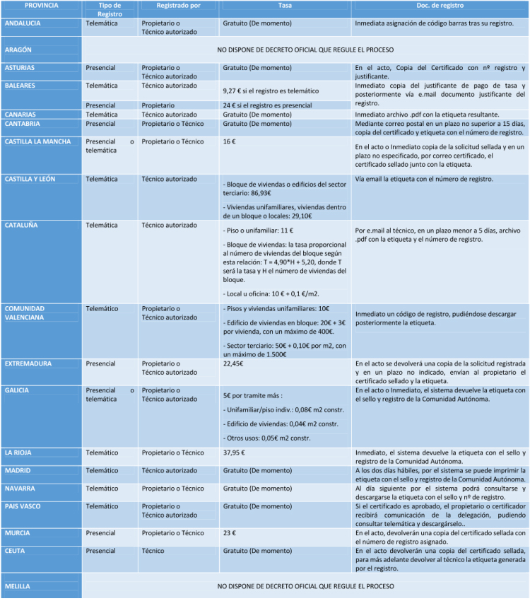 De la tabla anterior, se puede concluir que las tasas administrativas aplicables por el registro del Certificado Energético, difiere de una Comunidad Autónoma de otra, dado que mientras que existen Comunidades autónomas donde dicho registro aún es gratuitos (Andalucía, Asturias, Canarias, Cantabria, Madrid, Navarra, País Vasco y Ceuta), en otras dependiendo del tipo de inmueble tienen precios muy dispares, así como se muestra en la misma. Además los requisitos y documentos solicitados en cada Comunidad varían también de una a otra, así como el plazo para la obtención del mismo o incluso el tipo de registro y la persona que lo puede presentar, cuando todos deberían ser idénticos dado que el propósito inicial es el mismo.