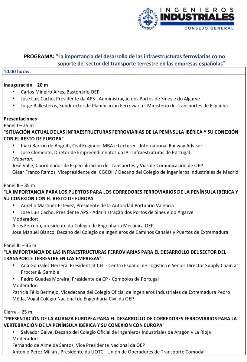 La cumbre ibérica que contará a lo largo del lunes con representantes del sector de la lógistica al más alto nivel como la presidenta del Centro Español de Logística (la patronal del sector), Ana González; Antonio Pérez Millán , presidente de la Unión de Operadores de Transporte Comodal, Pedro Guedes, presidente de Comboios de Portugal; las juntas directivas de los órganos colegiales de ingenieros industriales de ambos países, los presidentes de autoridades portuarias de Valencia, Aurelio Martínez y José Luís Cacho, Presidente de Administração dos Portos de Sines e do Algarve.