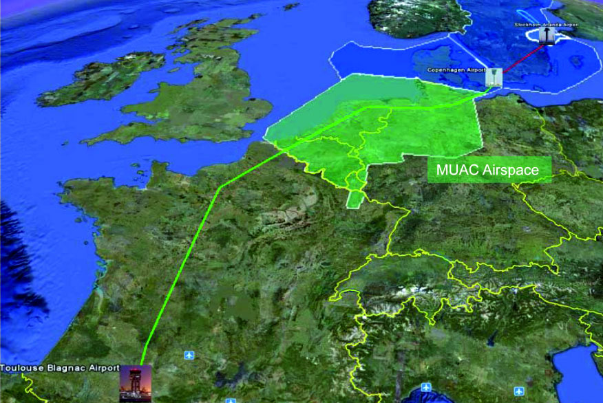 Tras un cambio a otro Sistema de Gestión de Vuelo (FMS), la aeronave partió desde Estocolmo con dirección a Copenhague para cumplir otras dos restricciones temporales antes de ascender hacia el espacio aéreo MUAC y regresar a Toulouse.