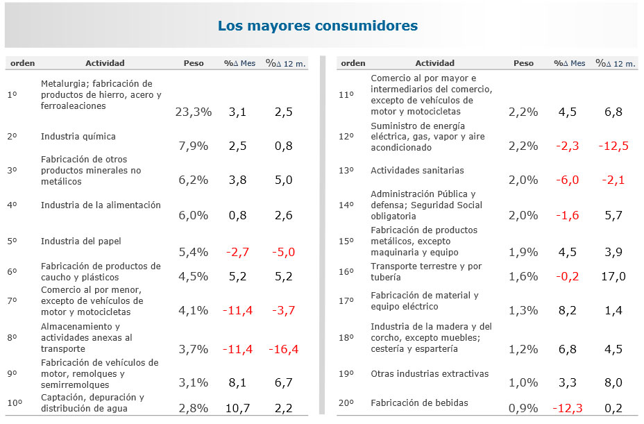 Asimismo, las actividades que más han aportado al crecimiento del consumo de las grandes empresas han sido: la metalurgia con un aumento del 3,1%, la captación, depuración y distribución de agua (10,7%), la fabricación de vehículos de motor, remolques y semirremolques (8,1%), la fabricación de otros productos minerales no metálicos (3,8%) y la fabricación de productos de caucho y plásticos (5,2%).