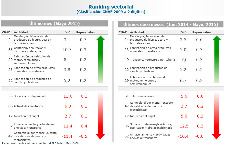 Comparado con mayo del 2014, de las cinco actividades con mayor consumo eléctrico, la demanda de la metalurgia creció un 3,1%, la industria química un 2,5%, la fabricación de otros productos minerales no metálicos un 3,8%, la industria de la alimentación un 0,8% y la del papel descendió un 2,7%.