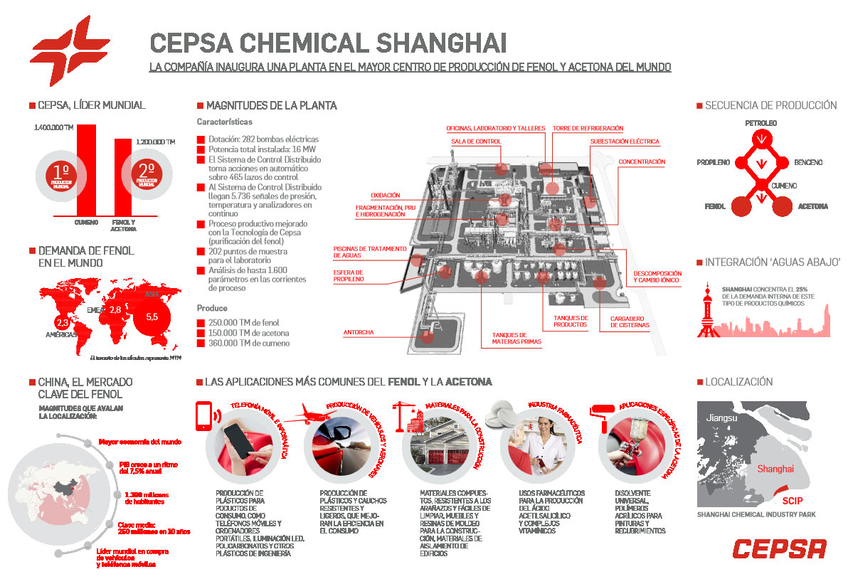 La nueva planta de Cepsa en Shanghái, inaugurada este pasado mes de abril, ha convertido a la compañía en el segundo mayor productor mundial de fenol y acetona. La planta tiene una capacidad productiva de 250.000 toneladas de fenol y 150.000 toneladas de acetona, y ha supuesto una inversión de 300 millones de euros.