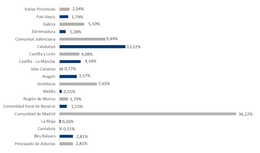 En cuanto a la localización del trabajo, en el conjunto de las comunidades autónomas, la mayor parte de las ofertas de empleo proceden de Madrid (36,22%), seguida de lejos por Cataluña (sobre todo del área de Barcelona) (13,52%), y a continuación la Comunidad Valenciana (9,44%), en especial las provincias de València y Alacant, y Andalucía (7,65%), destacando Málaga y Sevilla.