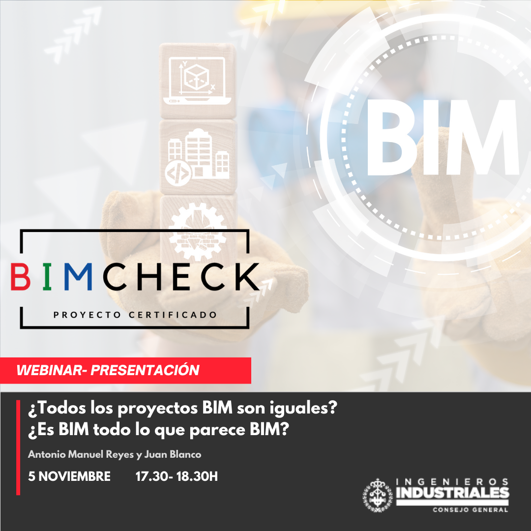 El próximo jueves 5 de noviembre a las 17:30, el Consejo General de Colegios Oficiales de Ingenieros Industriales (CGCOII) realizará un webinar para presentar BIMCheck, un servicio de auditoría diseñado por el Consejo que ofrece a las empresas y organismos que lo utilicen una certeza neutral del nivel de detalle alcanzado en el modelo BIM y, en general, de su adecuación al Plan de Ejecución BIM del Proyecto.