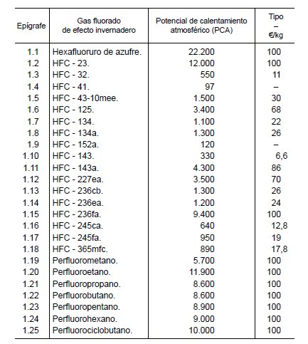 A partir del 1 de enero de 2014 se crea el impuesto sobre los Gases Fluorados de Efecto Invernadero, según establece el artículo 5 de la Ley 16/2013, por el que se establecen medidas en materia de fiscalidad medioambiental y se adoptan otras de carácter tributario y financiero.
