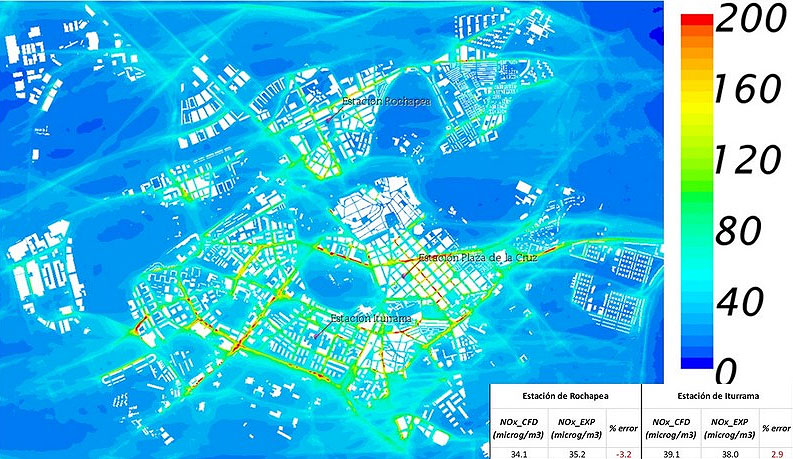 Una de las contribuciones más relevantes del CIEMAT se centra en modelizar y simular la contaminación de la ciudad de Pamplona a muy alta resolución utilizando modelos avanzados de mecánica de fluidos computacional (CFD, por sus siglas en inglés) o también llamados de Street Canyon. Estos modelos son capaces de simular las circulaciones de aire y la dispersión de contaminantes dentro de las calles de la ciudad a muy alta resolución. Es decir, son capaces de estimar la contaminación dentro de las calles de la ciudad cada pocos metros.