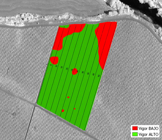 Mapa de zonificación de una parcela: zonas de alto o bajo vigor vegetativo e hileras de viñas numeradas (Fuente UPNA)