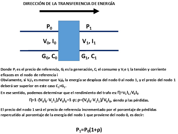 La construcción de la malla de precios Pij Irá en relación a las pérdidas que el nodo anterior de cálculo tenga para suministrar energía al siguiente nodo. Obsérvese que es posible que al pasar de un nodo al siguiente en el proceso iterativo de cálculo no se tienen que producir siempre subidas de precio en el sentido que la energía puede proceder del nodo al que estemos realizando el cálculo en cuyo caso las pérdidas serían de signo negativo, y el precio del nuevo nodo sería inferior. Todo esto es más fácil explicarlo con ejemplos que con palabras.