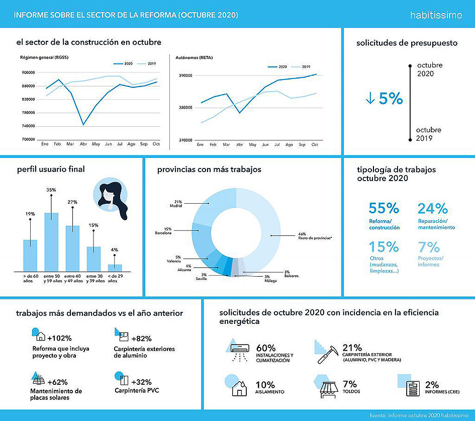 Con la llegada del invierno y la nueva situación social acontecida por la pandemia, los españoles han optado por mejorar la climatización y el confort de su vivienda tras la necesidad de permanecer más tiempo en la misma. Una tendencia que se refleja en la última edición del “Informe sobre el sector de la reforma”, editado por la plataforma para la mejora del hogar habitissimo, donde se afirma que, de la totalidad de solicitudes de servicio recibidas durante el pasado mes de octubre, un 14% han tenido relación con alguna actuación con incidencia directa en la eficiencia energética de la vivienda. Unos datos que siguen reflejando una ligera tendencia al alza durante este año (en agosto representaban un 12% y en septiembre un 13%).
