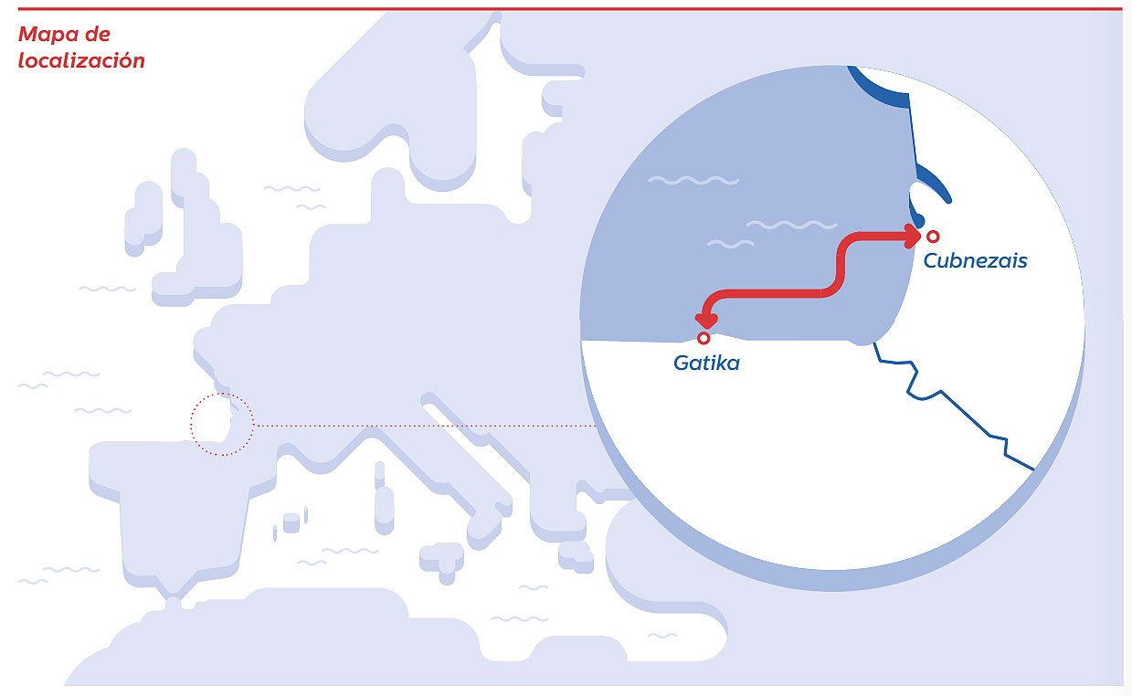 Con una longitud de 400 kilómetros entre la subestación de Gatika (cerca de Bilbao) y la de Cubnezais (cerca de Burdeos), contará con una estación conversora en cada extremo del enlace que permitirá transformar la corriente alterna en continua y a ésta nuevamente en alterna para conectarse a la red de transporte de electricidad de cada país.