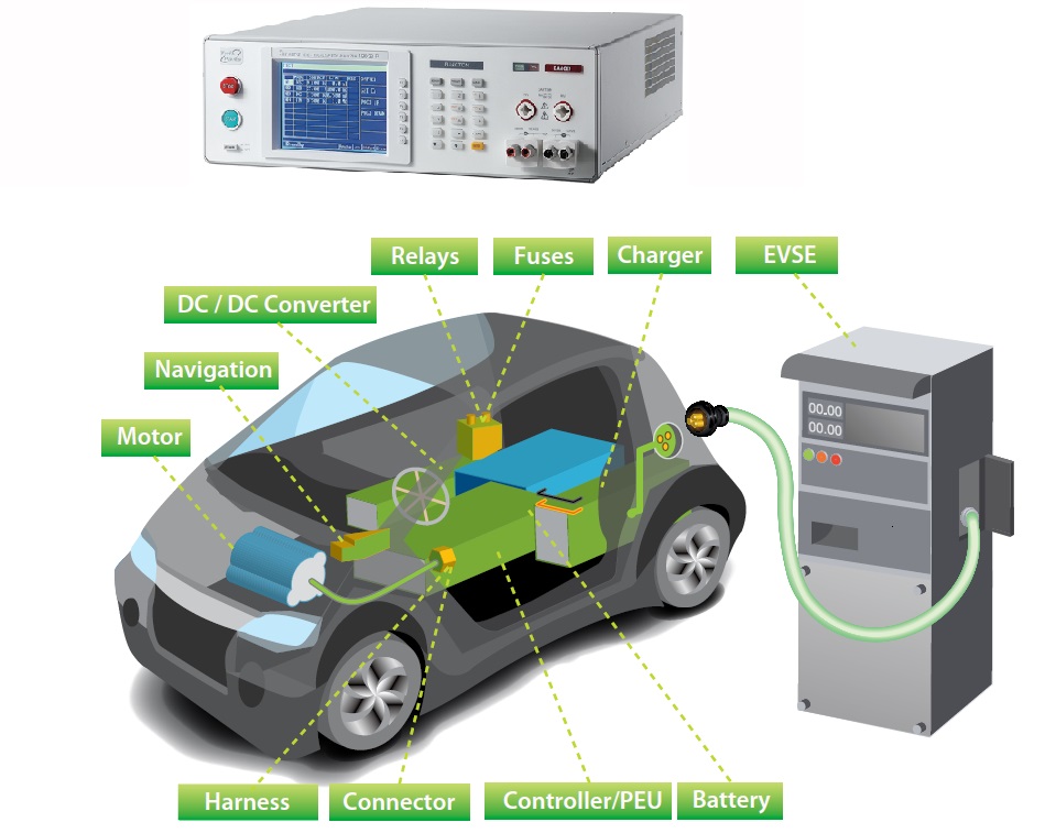 - Prueba de Rigidez a Alta Tensión (ISO 6469-3, GB/T 18384-3). Cortocircuitando los terminales y cables de señal primario con los puntos de tierra, y aplicando alta tensión se mide la corriente.