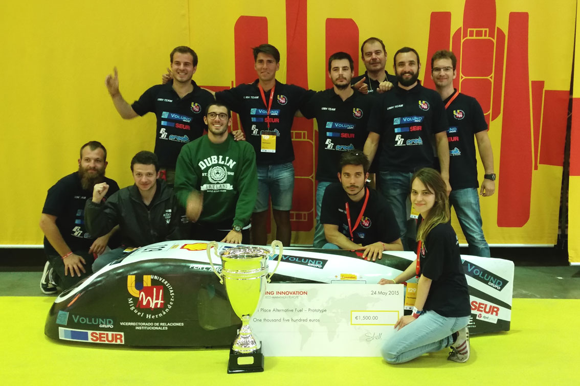 El “Dátil 2015” de la Universidad Miguel Hernández (UMH) de Elche ha logrado la primera posición en la carrera internacional “Shell Eco Maratón” en la modalidad de etanol, tras recorrer 1.496 kilómetros con un litro de este combustible. Además, el vehículo de la UMH ha logrado batir el récord entre los equipos españoles, que ya ostentaban en la edición anterior.25-05-15-ganadores coche dátil