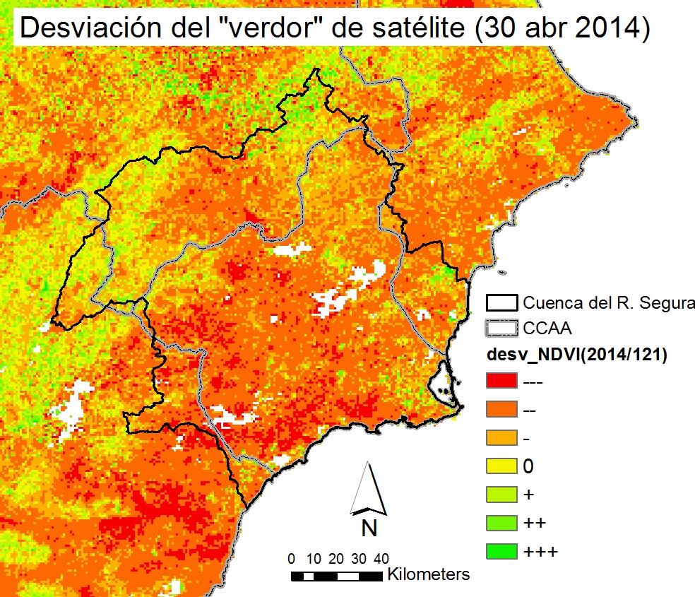 La escasez de precipitaciones desde el 1 de octubre, inicio del periodo hidrológico, ha sido especialmente intensa en el sureste español. El ‘verdor’ de la vegetación medido con satélites, que es un indicador estrechamente relacionado con el estado productivo de la vegetación, es muy inferior al valor promedio registrado en el sureste en el periodo 2002-2012.