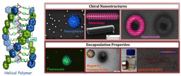 Con su trabajo, las investigaciones de CIQUS han incorporado esta familia de polímeros al campo de las nanoestructuras. Los diferentes tipos de nanoestructuras (nanoesferas, nanotubos, nanotoroides) se han obtenido a partir de un único polímero helicoidal y cationes de metales diversos. Estos últimos fijan conformaciones específicas, actúan como agentes intercalantes y modulan el sentido helicoidal del polímero (giro a derechas o a izquierdas). Como resultado, se obtienen nanoestructuras quirales con diferentes formas. En su interior se pueden encapsular diversas sustancias orgánicas e inorgánicas.