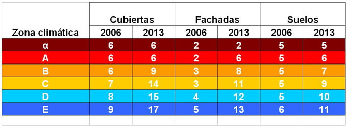 De esta manera puede hacerse un comparativo sencillo entre la antigua normativa (CTE 2006) y las nuevas exigencias (CTE 2013) para elementos constructivos generales en las diferentes zonas climáticas.