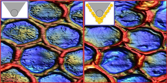 Imagen: (Fuente CSIC). Comparativa de imágenes de AFM tomadas sobre la misma región de unos ópalos inversos. A la izquierda, la imagen adquirida con una punta comercial. A la derecha, imagen equivalente tomada con una punta modificada con la tecnología patentada por el CSIC. Se puede observar que el espesor de las paredes es significativamente menor en la imagen de la derecha, gracias al incremento de la resolución lateral obtenido con esta tecnología. Tamaño de imagen 450x450nm2. Crédito: L. Martínez, M. Tello