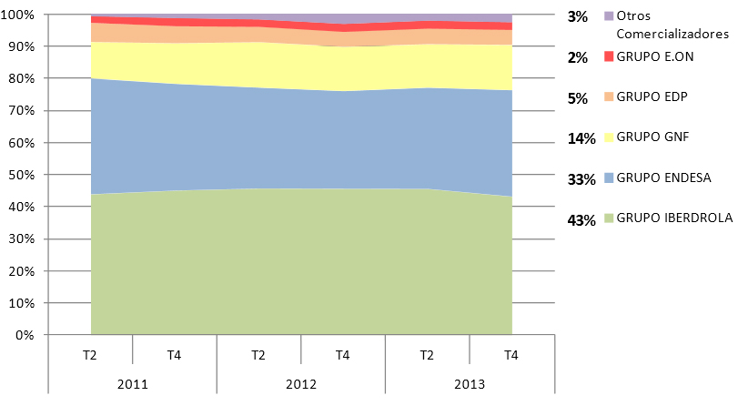 Las cinco grandes eléctricas concentran el suministro a tarifa por imperativo legal, y las tres comercializadoras con mayor cuota de mercado suministran el 90% de la electricidad en el mercado libre. Las compañías que realizan la distribución en una zona determinada, siguen teniendo la hegemonía sobre la comercialización.