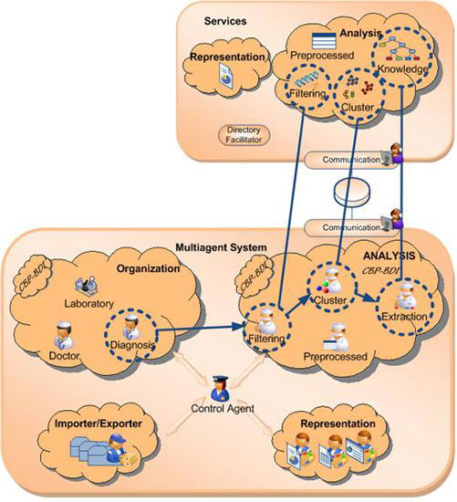 El sistema incorpora diferentes técnicas de minería de datos, estadísticas y de inteligencia artificial que son aplicables como acciones en los flujos de análisis. El modelo organizativo se puede aplicar sobre diferentes tipos de datos que requieran cierta carga de procesamiento. Concretamente, la propuesta se probó sobre datos de bioinformática para la clasificación de pacientes a partir análisis genéticos, en particular pacientes con leucemias de varios tipos y con datos procedentes de tumores cerebrales. El sistema trata de simular el comportamiento del personal médico de laboratorio realizando las etapas pre-procesamiento, filtrado de información, agrupamiento y clasificación comentados anteriormente, de tal forma que el modelo selecciona las técnicas que hay que aplicar en las diferentes etapas y su secuencia, generando así flujos de análisis de los datos de modo automático que mejoran los resultados obtenidos en análisis previos realizados manualmente.