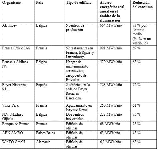 La cadena de comida rápida francesa Quick ha logrado por su parte reducir un 69% el consumo de luz (991MWh/año) tras promover mejoras en un total de 52 de sus restaurantes en Francia, Bélgica y Luxemburgo, el Banco de Francia ha reducido el suyo un 78% (68MWh/año) y la constructora Vinci Park un 61% (250MWh/año) gracias a las mejoras en uno de los aparcamientos que explota.