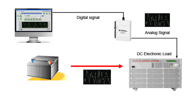 El software de simulación de la forma de onda de corriente dinámica de descarga proporcionado por Chroma es capaz de leer los datos de la forma de onda registrada previamente en formato Excel y usar un convertidor A/D para controlar la carga electrónica y descargar el mismo perfil de corriente de la batería. Esto permite tanto a los fabricantes de automoción como de baterías simular descargas irregulares de las baterías y realizar ensayos repetitivos en laboratorio en lugar de hacer los ensayos en ruta que son tan costosos cada vez que se requieren ensayos de durabilidad en células de baterías.