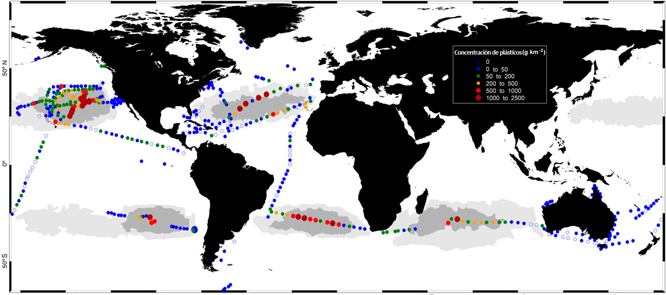 La Expedición Malaspina, liderada por el Consejo Superior de Investigaciones Científicas (CSIC), ha demostrado que existen cinco grandes acumulaciones de residuos plásticos en el océano abierto, que coinciden con los cinco grandes giros de circulación de agua superficial oceánica.