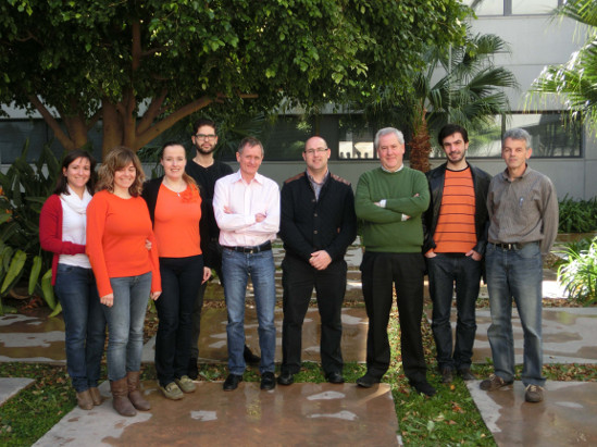 Miembros del equipo investigador. De izquierda a derecha: Elísabeth Chorro (U. Alicante), Esther Perales (U. Alicante), Alexandra Rost (AUDI AG), Omar Gómez (U. Alicante), Thomas Dauser (AUDI AG), Francisco Miguel Martínez-Verdú (U. Alicante), Manuel Melgosa (U. Granada), Luis Gómez-Robledo (U. Granada) y Valentín Viqueira (U. Alicante).