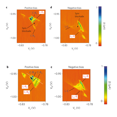 La figura de arriba muestra la corriente a través de tres puntos cuánticos, en un campo magnético de 0.2 Teslas en las dos direcciones del voltaje. La corriente se apaga en las regiones de bloqueo de espín (“Spin Blockade”). En la figura de abajo, se muestra la corriente a través de tres puntos cuánticos sin la presencia de un campo magnético. Las líneas L-R indican corriente electrónica de izquierda (L) a derecha (R) sin pasar por el punto cuántico central./ CSIC