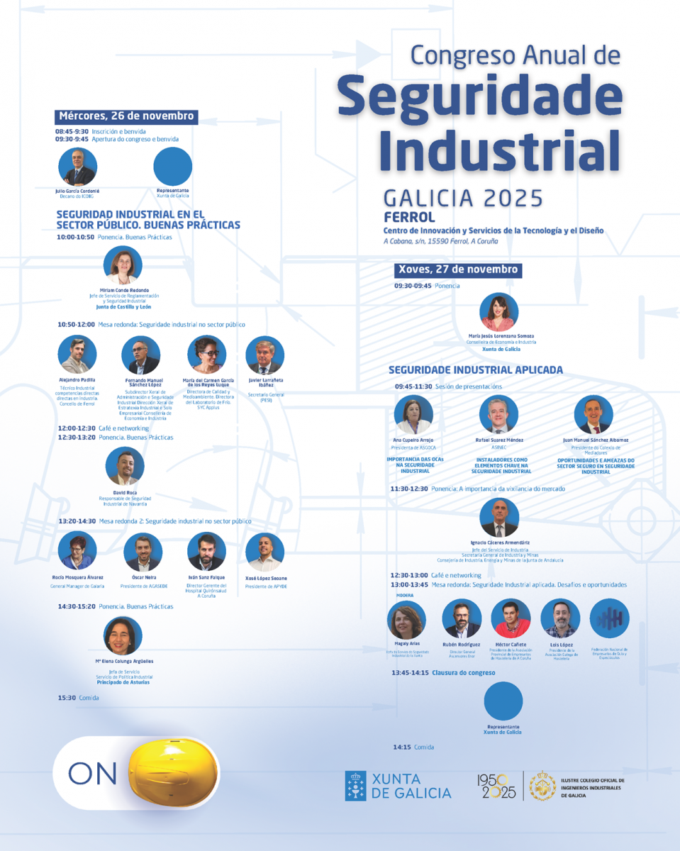 Los próximos 26 y 27 de noviembre tendrá lugar en Ferrol el Congreso de Seguridade Industrial organizado por el Colegio de Ingenieros Industriales de Galicia y la Xunta. El congreso se celebrará en la Agencia Galega de Innovación (GAIN), uno de los espacios de referencia para el impulso tecnológico y la modernización industrial en Galicia.