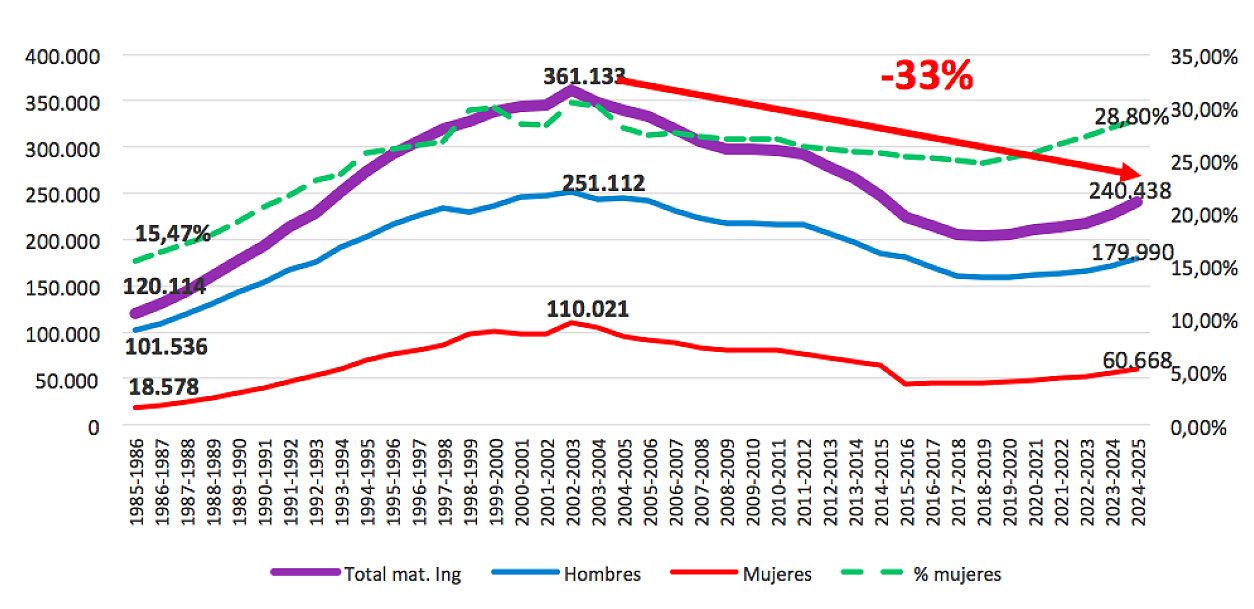 Según el informe, el número de estudiantes matriculados en titulaciones de Ingeniería ha caído un 33% desde el periodo 2002-2003. Mientras en 1985-86 los estudios de Ingeniería representaban el 14% del total universitario, alcanzaron su máximo en 2002-2003 con un 24%, para descender hasta el 17% en el curso 2024-2025.